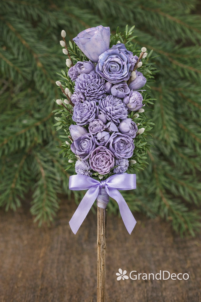Każdy kwiat przymocuj osobno cienkim drutem. Końcówki drutu prowadź w dół wzdłuż patyka i zabezpieczaj taśmą florystyczną.