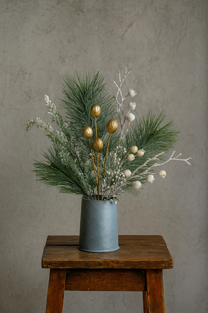 W kompozycjach naturalnych połącz złote orzechy z gałązkami świerku, eukaliptusa, szyszkami i jutą.