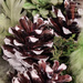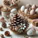 wielkanocna kompozycja z małymi brązowymi szyszkami o białych brzegach, udekorowana naturalnymi elementami