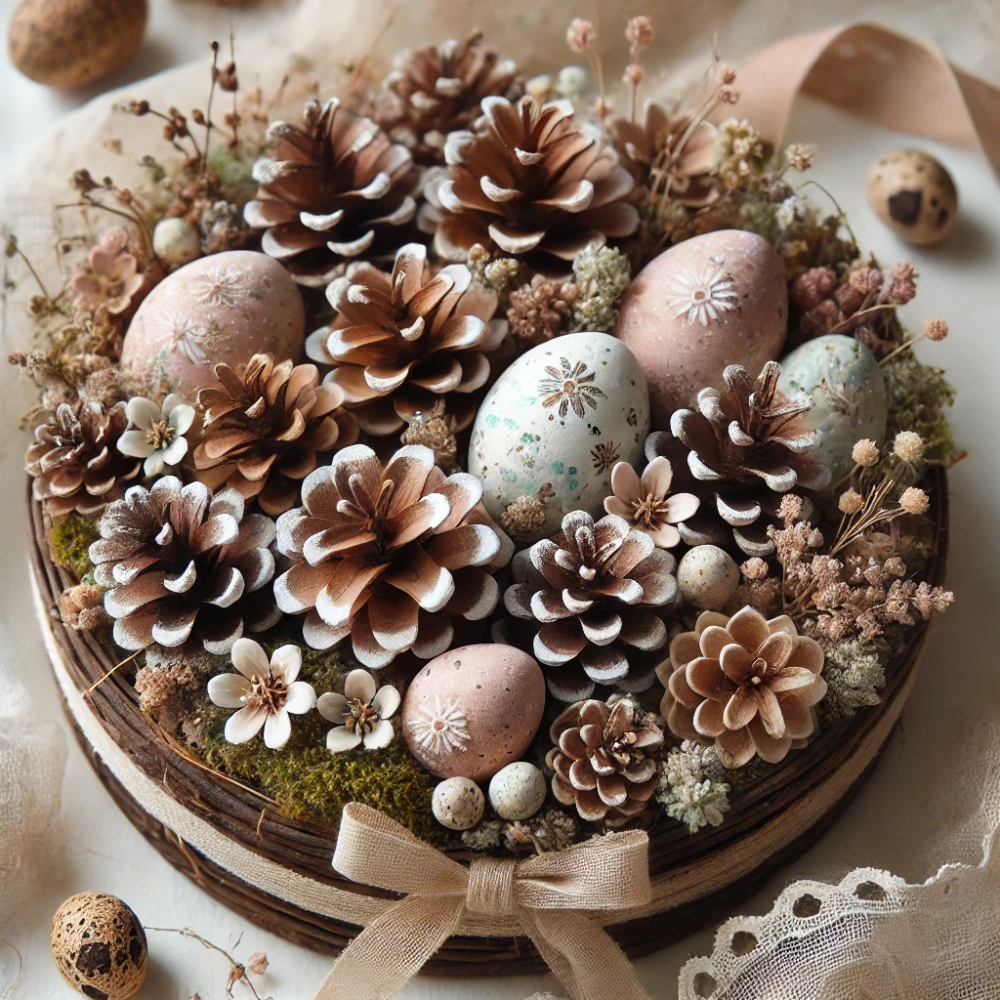 wielkanocna kompozycja z małymi brązowymi szyszkami o białych brzegach, uzupełniona pastelowymi jajkami, mchem i rustykalnymi detalami