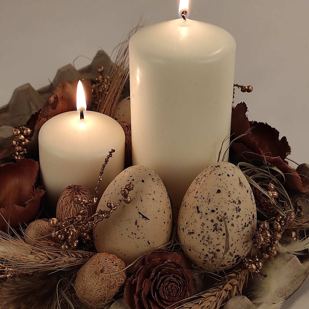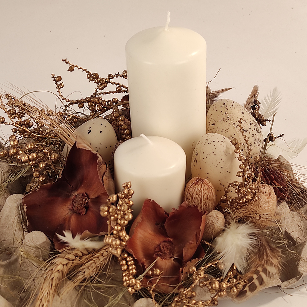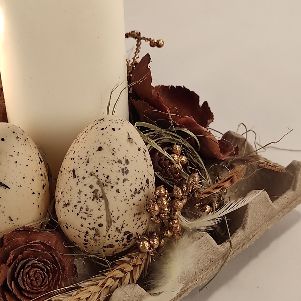 Podaruj swoim bliskim, klientom lub partnerom biznesowym wyjątkową, autorską dekorację wielkanocną, która łączy tradycję, elegancję i ekologiczną harmonię. Ta ręcznie wykonana kompozycja to nie tylko ozdoba na świąteczny stół, ale także symbol odrodzenia, dobrobytu i równowagi.