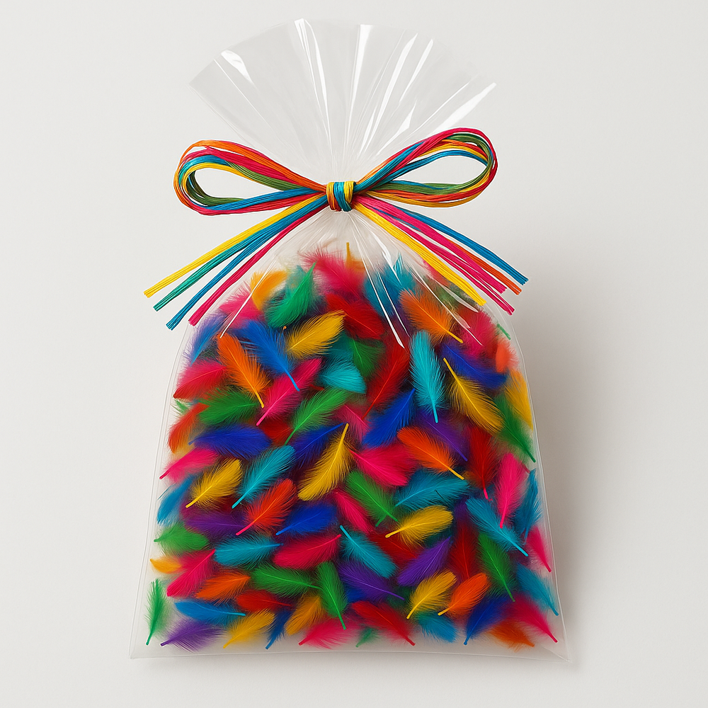 Opakowanie: worek celofanowy z kokardką z wielokolorowej rafii