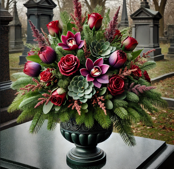 Okazały stroik nagrobny o długości 60 cm, wykonany z gęstego zielonego igliwia i ozdobiony bordowymi oraz fioletowymi kwiatami. Połączenie głębokich barw symbolizuje zadumę, duchowość i pamięć, a jednocześnie podkreśla elegancki charakter dekoracji.