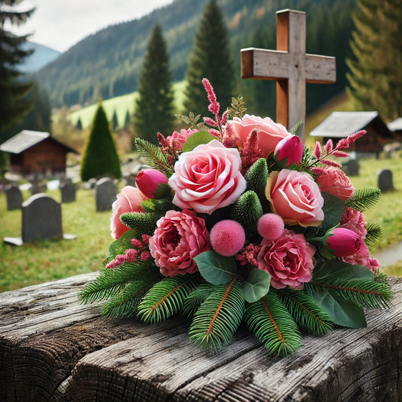 Elegancki stroik nagrobny o długości 40 cm, wykonany z gęstego, zielonego igliwia i ozdobiony różowymi kwiatami oraz dekoracyjnymi trawami. Subtelna kolorystyka w odcieniach różu symbolizuje miłość, wdzięczność i delikatność, dzięki czemu kompozycja prezentuje się lekko, a jednocześnie elegancko.