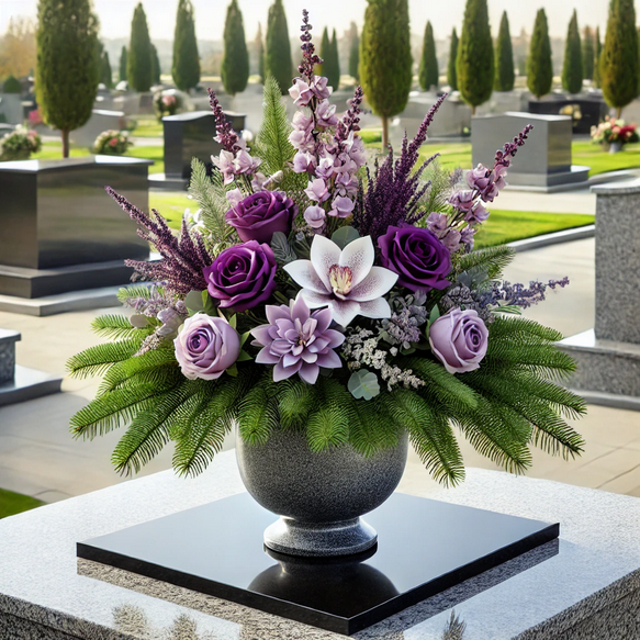 Stroik nagrobny 50 cm – fioletowe kwiaty na zielonym igliwiu
