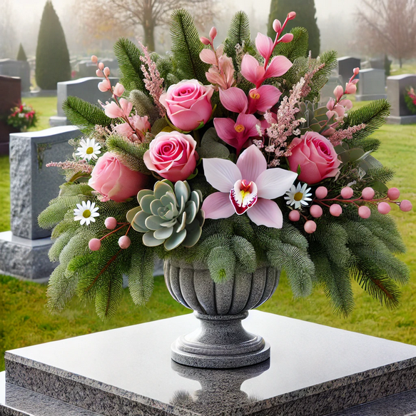 Elegancki i trwały stroik na grób, który łączy delikatne różowe kwiaty z gęstym, zielonym igliwiem. Kompozycja została zaprojektowana tak, aby podkreślać subtelność i jednocześnie nadawać miejscu spoczynku wyjątkowy, elegancki charakter. Różowe kwiaty symbolizują miłość, wdzięczność i pamięć, dlatego idealnie sprawdzą się jako ozdoba nagrobna na Wszystkich Świętych, Zaduszki czy inne uroczystości rodzinne.
