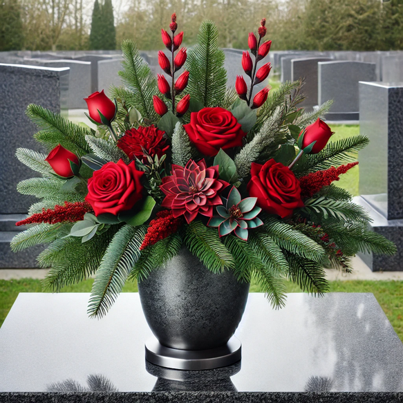Okazały bukiet nagrobny o długości 50 cm, wykonany z gęstego zielonego igliwia i ozdobiony czerwonymi różami oraz dekoracyjnymi dodatkami. Intensywna czerwień symbolizuje miłość, pamięć i szacunek, dlatego kompozycja w dostojny sposób podkreśla wyjątkowy charakter miejsca spoczynku.