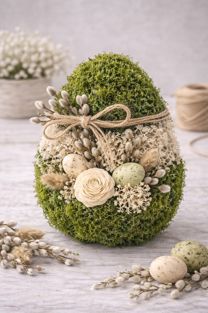 Naturalne mchy i kwiaty shola sprawiają, że dekoracja jest spokojna, elegancka i ponadczasowa, idealna na Wielkanoc i całą wiosnę.
