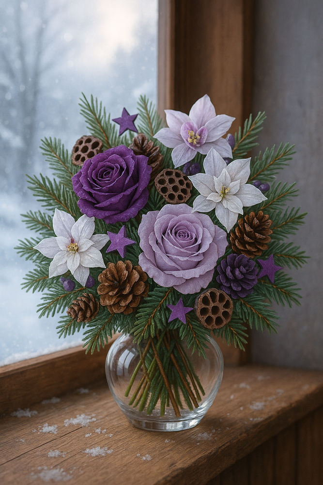 Bukiet świąteczny z igliwia w fioletowo-naturalnych barwach to połączenie klasyki i nowoczesności. Wprowadza do wnętrza ciepły, świąteczny nastrój oraz subtelny zapach lasu. Doskonale komponuje się z dekoracjami w kolorze złota, kremu i srebra.
