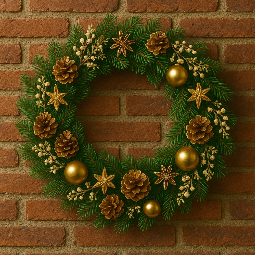 Połączenie naturalnych elementów – igliwia, szyszek i anyżu – z eleganckimi, złotymi dodatkami tworzy harmonijną i przytulną kompozycję świąteczną. To wianek, który pięknie pachnie, przyciąga wzrok i wprowadza do wnętrza ciepły blask Świąt Bożego Narodzenia.