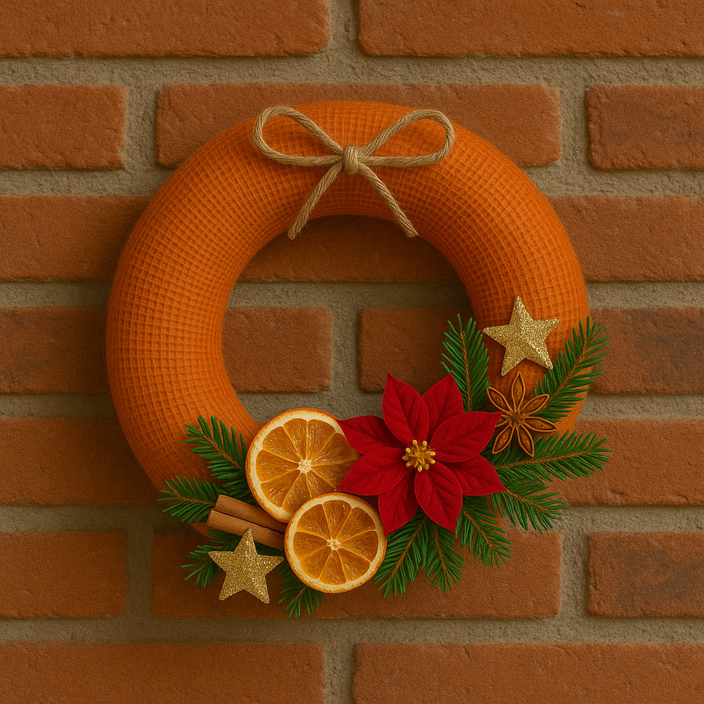 Połączenie pomarańczowej juty z naturalnymi dodatkami i ciepłymi barwami Świąt tworzy harmonijną, przytulną dekorację. Wianek pachnie pomarańczą, cynamonem i anyżem, wprowadzając do wnętrza wesoły klimat Bożego Narodzenia.