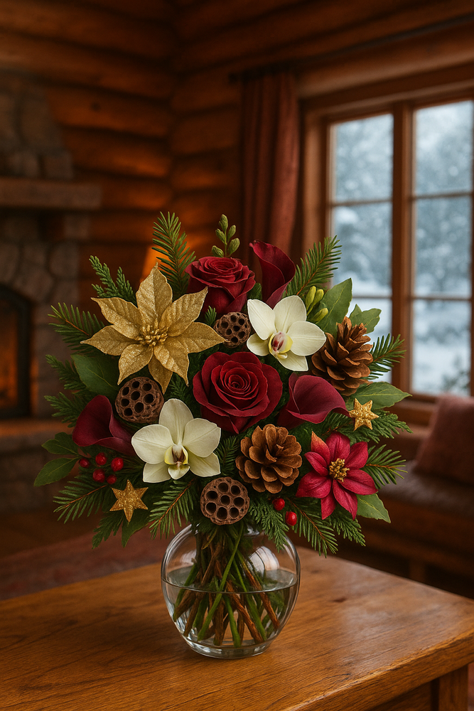Ten bukiet to esencja świątecznej elegancji i bogactwa natury. Połączenie zieleni igliwia z głębokimi tonami bordo, złotymi akcentami i kremową subtelnością tworzy kompozycję pełną ciepła, harmonii i luksusu. Szyszki i lotosy dodają naturalności, a połysk złotych dodatków – świątecznego blasku. To dekoracja, która przyciąga wzrok i podkreśla styl, klasę i wyjątkowy klimat Świąt Bożego Narodzenia.