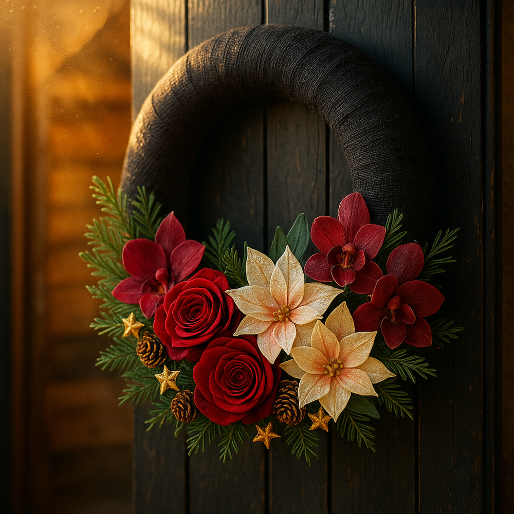 Czarna juta nadaje wiankowi nowoczesnego, eleganckiego charakteru, a delikatne kwiatowe dekoracje wprowadzają świąteczne ciepło i harmonię. Połączenie róż, storczyków i poinsecji z drobnymi ozdobami sprawia, że to subtelna, ale efektowna dekoracja, idealna dla osób ceniących styl i oryginalność.