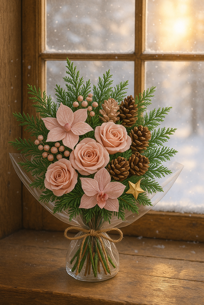 Ten wyjątkowy bukiet o wysokości około 30 centymetrów wykonany jest z zielonych gałązek iglastych, ozdobiony różowymi różami, gwiazdami betlejemskimi (poinsecjami), szyszkami i delikatnymi złotymi akcentami. To ręcznie wykonana dekoracja, która łączy świąteczny blask z naturalnym urokiem zieleni.