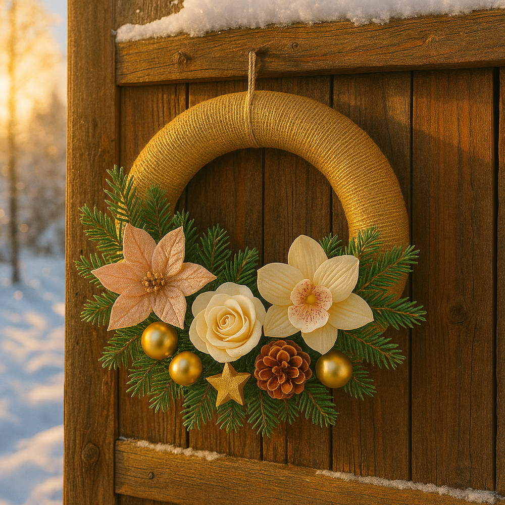 Ten wyjątkowy wianek o średnicy około 25 centymetrów wykonany jest ręcznie z dbałością o każdy detal. Ozdobiony świątecznymi kwiatami, szyszkami, złotymi dodatkami i zielonym igliwiem, pięknie błyszczy w świetle i wprowadza do wnętrza ciepły, luksusowy klimat Bożego Narodzenia.