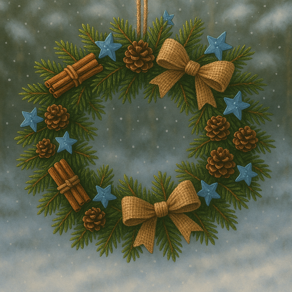 Materiał: prawdziwe gałązki iglaste, juta, drewno, szyszki, cynamon