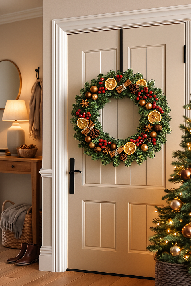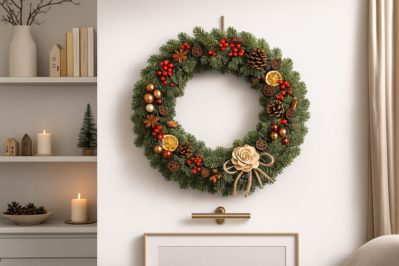 Świerk, dodatki i ozdoby są starannie wyselekcjonowane – dzięki temu wianek wygląda świeżo i efektownie przez długi czas.