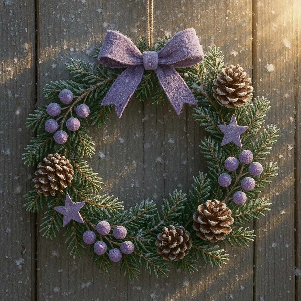 Naturalny, ręcznie wykonany wianek ze świeżego igliwia zachwyca leśnym urokiem i delikatnym, zimowym klimatem. Ozdobiony szyszkami z malowanymi brzegami, drewnianymi fioletowymi gwiazdkami i jutową kokardą, tworzy harmonijną, lekko ośnieżoną kompozycję. Pachnący lasem, idealny na drzwi, stół lub jako świąteczny prezent w rustykalnym stylu.