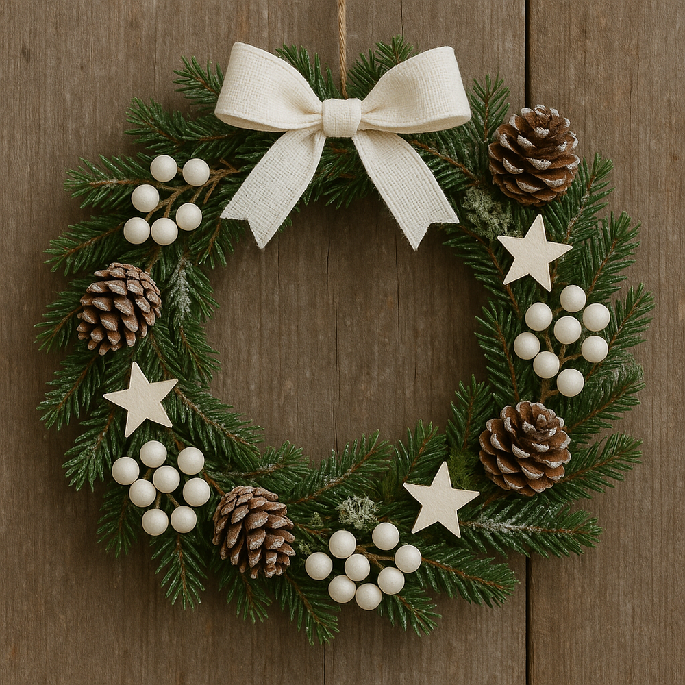 Elegancki i subtelny zimowy wianek w stylu minimalistycznym to połączenie naturalnego igliwia z delikatnymi, białymi dodatkami, które przywodzą na myśl spokój i czystość zimy. Ręcznie wykonany, ozdobiony drewnianymi gwiazdkami, gałązkami z białymi kuleczkami i przewiązany jutową kokardą, tworzy harmonijną kompozycję w naturalnym tonie.