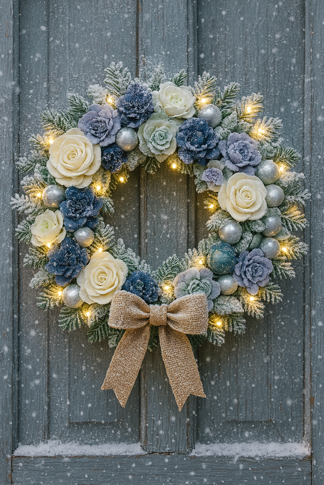 Wianek zbudowany jest z gęsto ułożonych, lekko oszronionych gałązek iglastych, pomiędzy którymi rozmieszczono dekoracyjne kwiaty przypominające róże w odcieniach kremu, błękitu i stalowego granatu. Całość uzupełniają srebrne i perłowe bombki, które nadają kompozycji elegancji i subtelnego blasku.