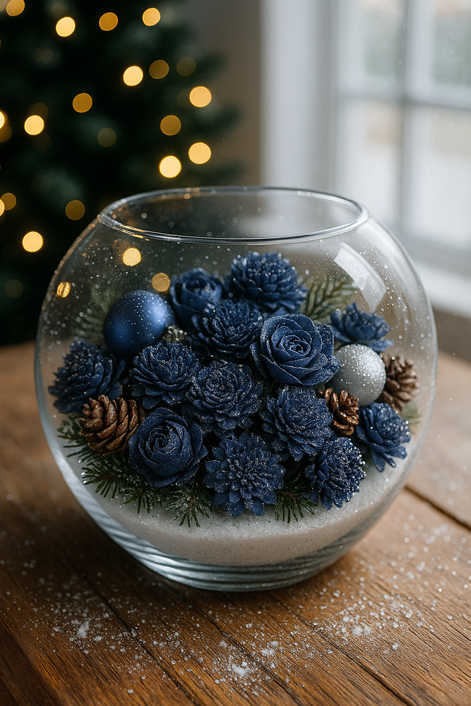 Kwiaty shola wykonane są z naturalnej masy roślinnej . Są lekkie, trwałe i niezwykle dekoracyjne — każdy płatek formowany ręcznie. W połączeniu z granatem i srebrem tworzą kompozycję o nowoczesnym, zimowym charakterze.