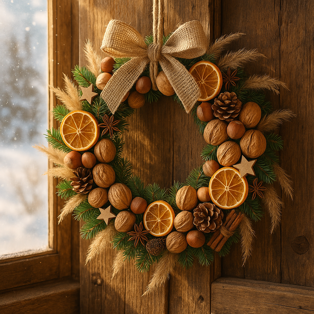 Wykonany na gęstej bazie z igliwia, ozdobiony prawdziwymi orzechami włoskimi, laskowymi, aromatycznymi plastrami suszonej pomarańczy, anyżem, szyszkami oraz naturalną kokardą jutową. Dodatkowym akcentem są subtelne drewniane gwiazdki i dekoracyjne kłosy traw, które nadają całości rustykalny, przytulny charakter.