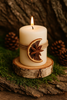 Świeca Świąteczna „Pachnąca Zima” na Brzozowym Drewnie – Naturalna Dekoracja Świąteczna z Pomarańczą i Anyżem