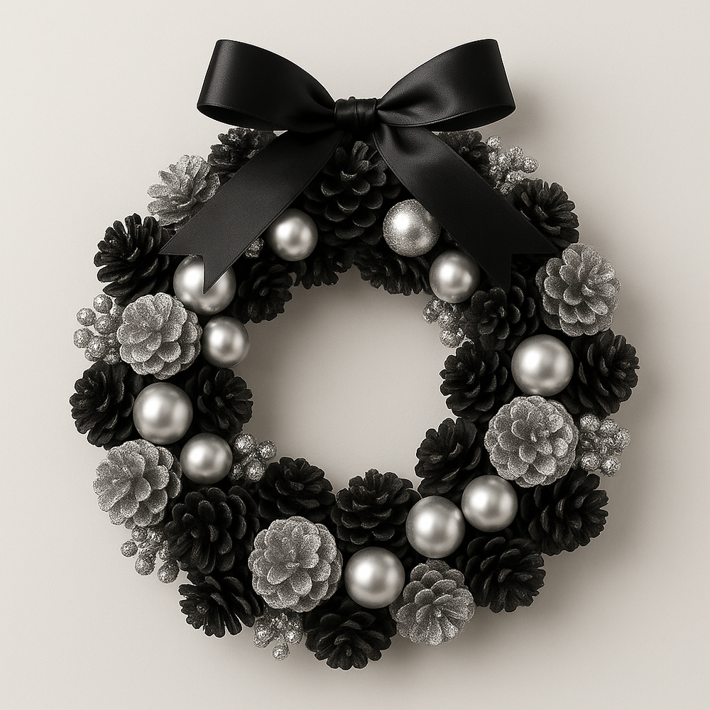 Jak zrobić elegancki wianek glamour z czarnych i srebrnych szyszek – świąteczna dekoracja w stylu GrandDeco krok po kroku