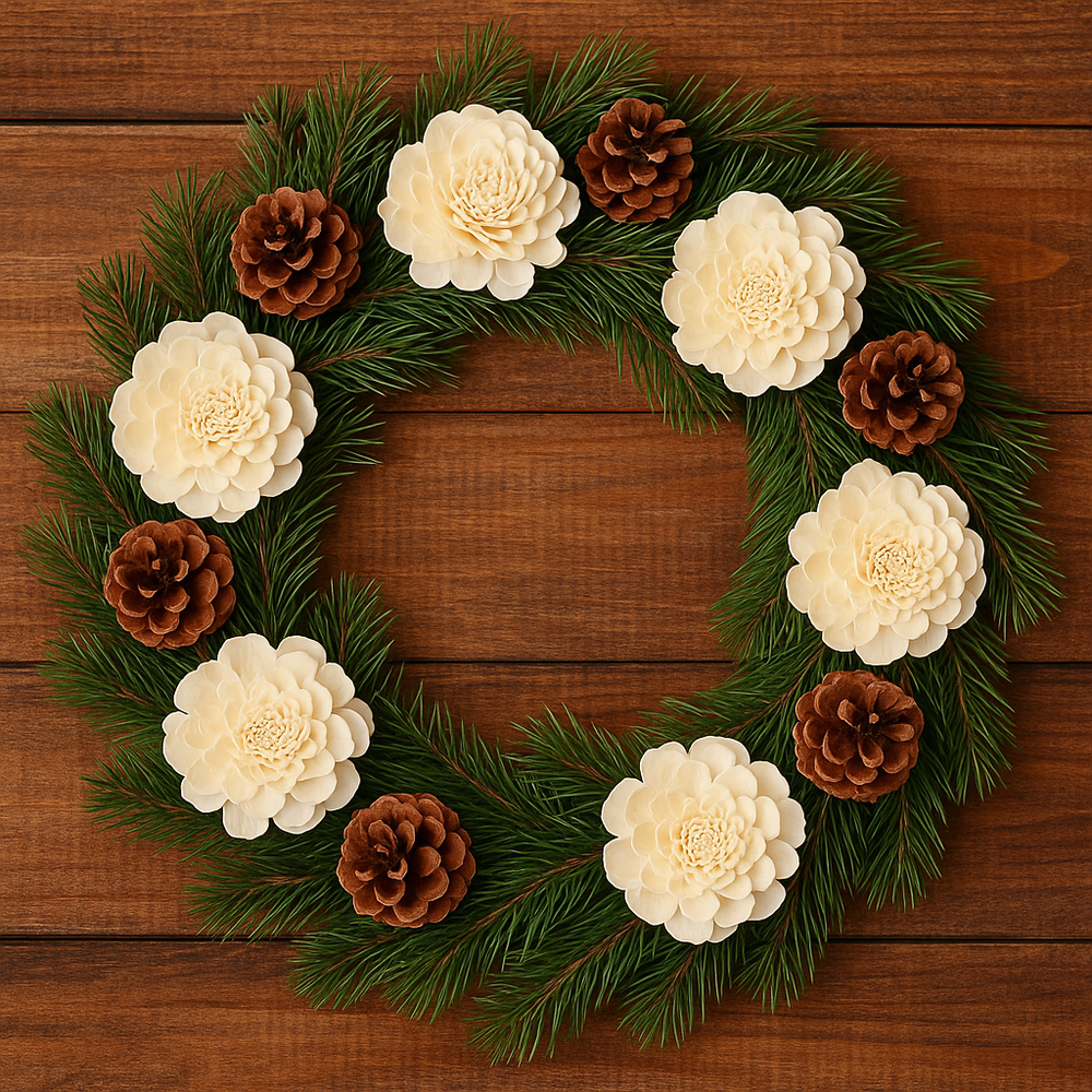 • Szyszki sosnowe w ciepłym brązie, pięknie kontrastujące z bielą kwiatów