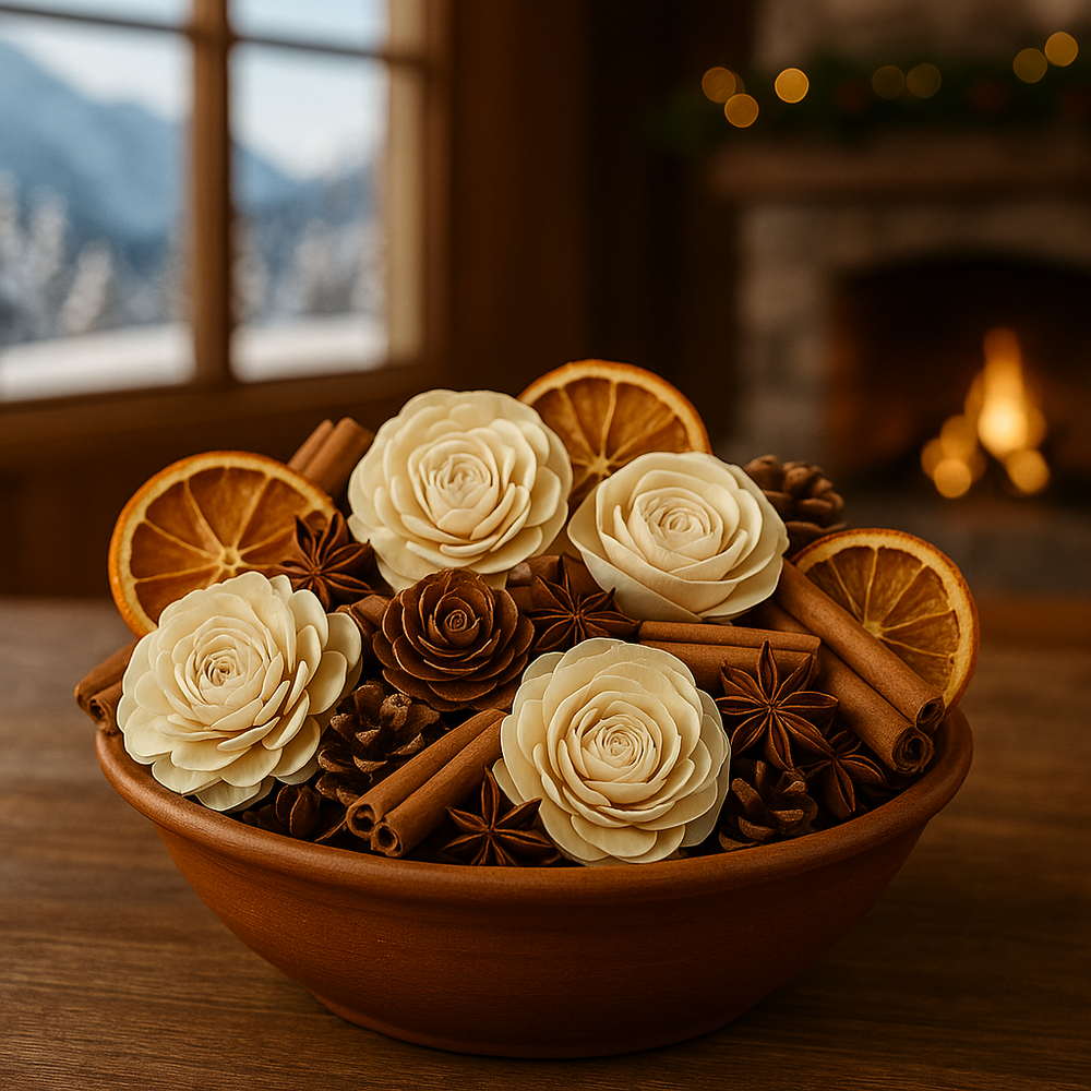 Połączenie suszonej Sholi (4–6 cm) z plastrami pomarańczy, drobnymi szyszkami, pokruszonym anyżem i cynamonem tworzy spójną, harmonijną kompozycję w ciepłych odcieniach natury.