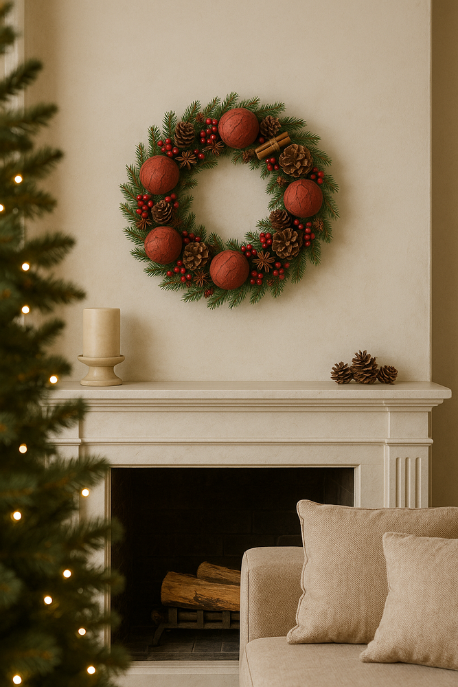 Elegancki świąteczny wianek wykonany z gęstych, żywozielonych gałązek świerku, ozdobiony czerwonymi kulami z naturalnej kory. Ręczne zdobienia obejmują szyszki, laseczki cynamonu, anyż oraz drobne czerwone jagody, które tworzą harmonijną, bogatą kompozycję o klasycznym zimowym charakterze. Całość utrzymana jest w naturalnej, ciepłej palecie barw – idealnej do świątecznych wnętrz w stylu klasycznym, rustykalnym lub minimalistycznym.
