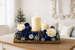 Dodaj po jednej świecy na każdej bazie, a przestrzeń wokół wypełnij szyszkami i kwiatami.