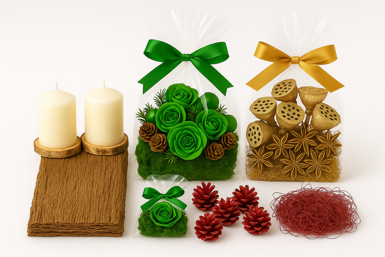 Ten starannie skomponowany zestaw DIY to idealna propozycja dla osób, które kochają tworzyć dekoracje pełne naturalnego uroku. Znajdziesz tu wszystko, czego potrzebujesz, aby przygotować świąteczną kompozycję – klasyczną, przytulną i efektowną. Zestaw łączy czerwień, zieleń, ciepłe drewno i złoto, dzięki czemu świetnie sprawdzi się zarówno do stroików na stół, jak i dekoracji na komodę, biurko czy jako baza pod prezent handmade.
