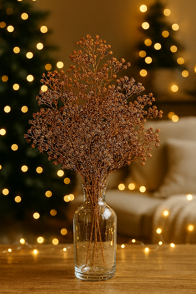 Każda gałązka została starannie pokryta dekoracyjną warstwą brokatu i metalicznej powłoki, tworząc głęboki efekt kolorystyczny przechodzący od jasnej miedzi po ciepłe brązy.