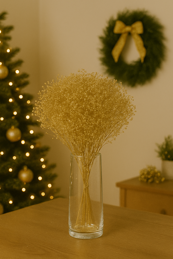 Złoty bukiet gipsówki to elegancka, świąteczna dekoracja, która natychmiast ociepla wnętrze i dodaje mu luksusowego charakteru. Delikatne, drobne kwiatuszki pokryte połyskującym złotym wykończeniem tworzą efekt subtelnej „mgiełki”, pięknie odbijającej światło lampek choinkowych.