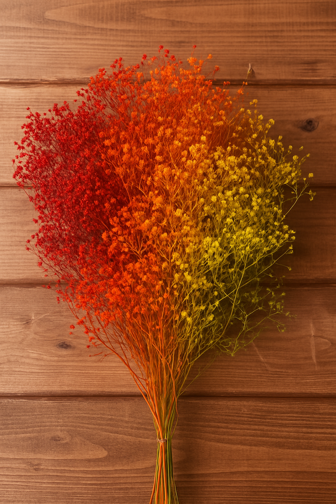 Wyjątkowy bukiet gipsówki w odcieniach od głębokiej czerwieni, przez intensywną pomarańczę, aż po ciepły, słoneczny żółty. Ta gradacja barw tworzy efekt naturalnego przejścia kolorów, przypominający zachód słońca lub jesienny płomień. Idealny jako dekoracja na stół, komodę czy do wazonu w aranżacjach boho, rustykalnych, jesiennych i świątecznych.