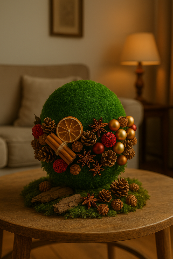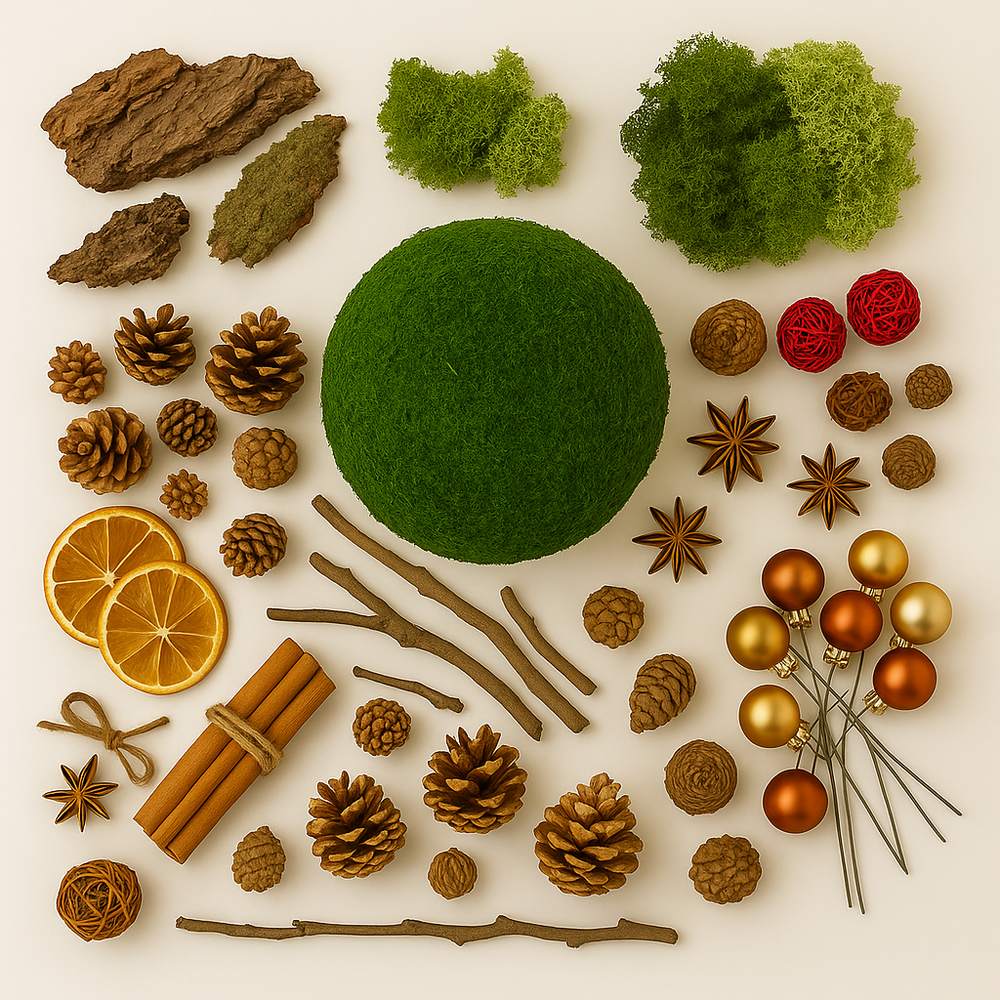 Stwórz wyjątkową dekorację w stylu leśnym dzięki kompletnemu zestawowi DIY, w którym główną bazą jest kula z mchu o średnicy 20 cm. To doskonała alternatywa dla klasycznych stroików i choinek – idealna na stół, komodę, parapet, recepcję lub jako elegancki element świątecznych aranżacji.