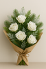 Ten niezwykle elegancki bukiet łączy w sobie pięć śnieżnobiałych róż o delikatnie oszronionych płatkach z kompozycją iglastych gałązek sosny oraz subtelnie bielonej tui. Chłodna, zimowa tonacja zieleni podkreśla czystość i wyrazistość róż, tworząc harmonijną, luksusową całość.