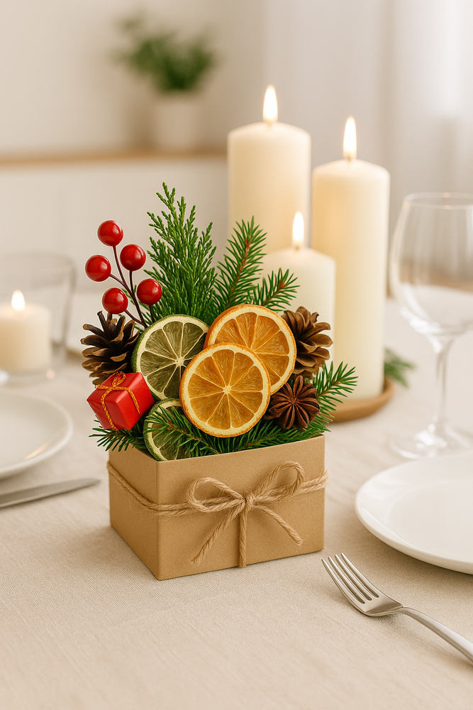 Naturalny, świąteczny stroik w pudełku to subtelna, ale niezwykle efektowna dekoracja, idealna na stół wigilijny, komodę czy świąteczne przyjęcie. Wykonany z najwyższej jakości naturalnych elementów, tworzy ciepły i przytulny klimat, wprowadzając do wnętrza zapach zimy i świątecznej atmosfery.