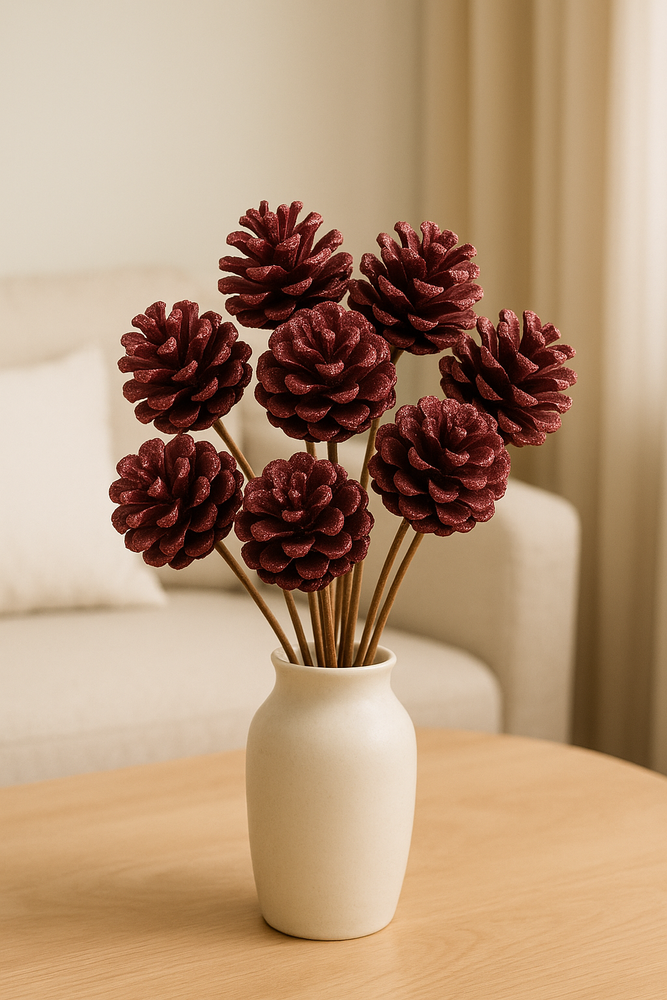 Dekoracyjny Bukiet Bordowych Szyszek XXL z Brokatem – 9 szt. | Duże główki 8 cm | Pik 40 cm