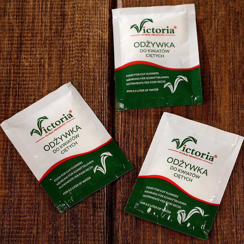 Odżywka jest jednym z najważniejszych produktów florystycznych. Można ją kupić w hurtowni i sklepie florystycznym. Praktyczne dozowanie w formie saszetek umożliwia dołączenie produktu do np bukietu kwiatów żywych.
