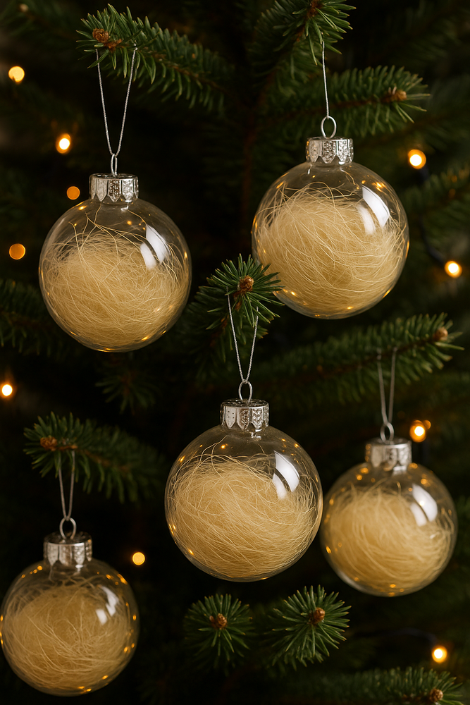 Przezroczyste bombki akrylowe wypełnione sizalem to jedna z najprostszych, a jednocześnie najbardziej eleganckich dekoracji choinkowych w stylu handmade. Sprawdzają się zarówno w aranżacjach glamour, jak i w naturalnych dekoracjach eco, bo można je łatwo dopasować do kolorystyki i klimatu wnętrza.