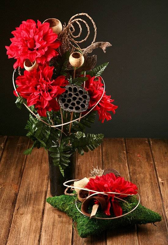 Suszone rośliny dają ciekawy efekt również w połączeniu ze sztucznymi kwiatami i dekoracyjnymi dodatkami.