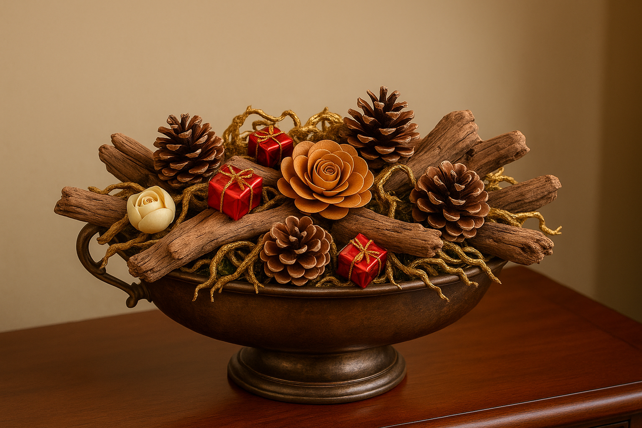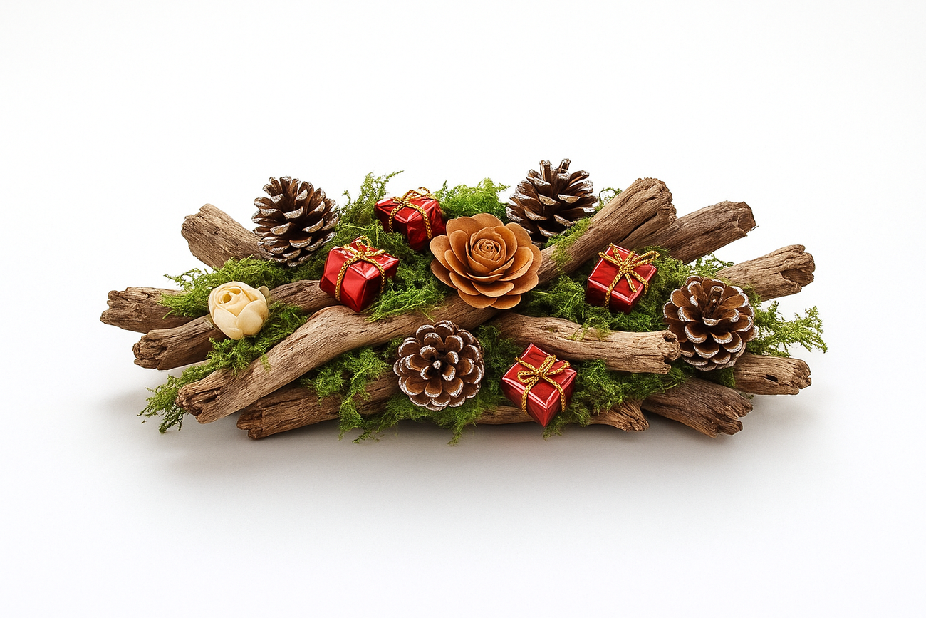 Elegancka, naturalna dekoracja świąteczna wykonana z korzeni kopi cone, miękkiego mchu, brązowych szyszek z malowanymi brzegami oraz kwiatów shola w odcieniu jasnego brązu. Akcentem dodającym świątecznego charakteru są czerwone prezenciki, które ożywiają całą kompozycję.