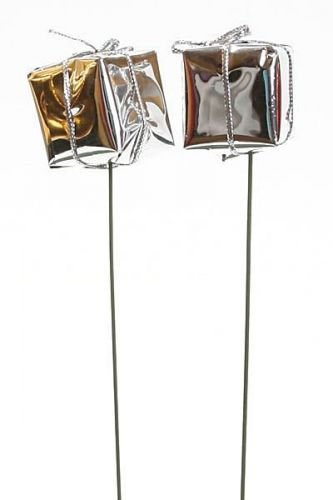 Eleganckie srebrne prezenciki na druciku to idealny dodatek do tworzenia świątecznych dekoracji. Każdy prezencik ma wielkość 2,5 cm i jest umieszczony na pikach o długości ok. 10 cm, dzięki czemu łatwo wbijesz je w mech, gąbkę florystyczną, stroik, choinkę, wieniec lub kompozycje z gałązek.