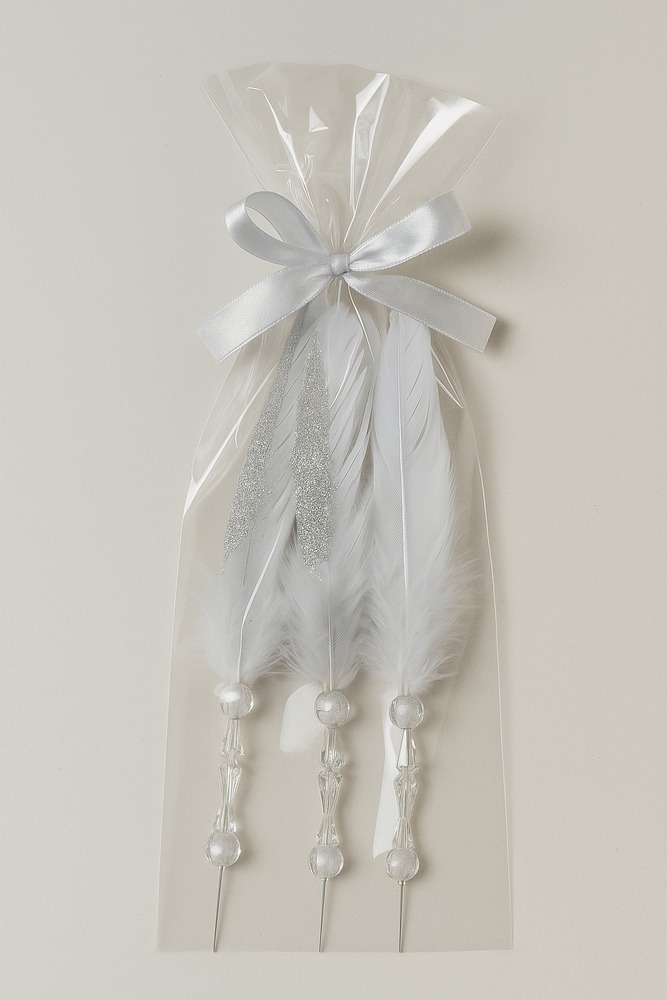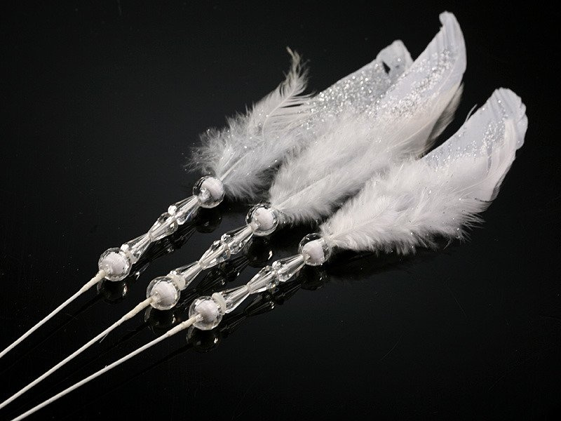 Efektowne, lekkie piórka w delikatnym odcieniu szarości, wykończone eleganckimi akcentami biżuteryjnymi – kryształkami i koralikami. Każde pióro osadzone jest na giętkim druciku florystycznym, dzięki czemu można je łatwo wkomponować w kompozycje, wianek, stroik, bukiet, świecę, prezent, stroik świąteczny lub dekorację wnętrza.