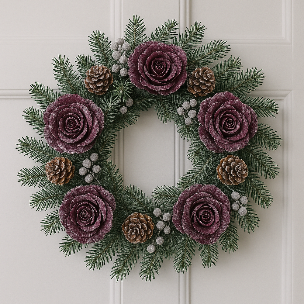 Fioletowe ośnieżone róże w połączeniu z igliwiem i szyszkami tworzą niepowtarzalną dekorację drzwi lub ściany.