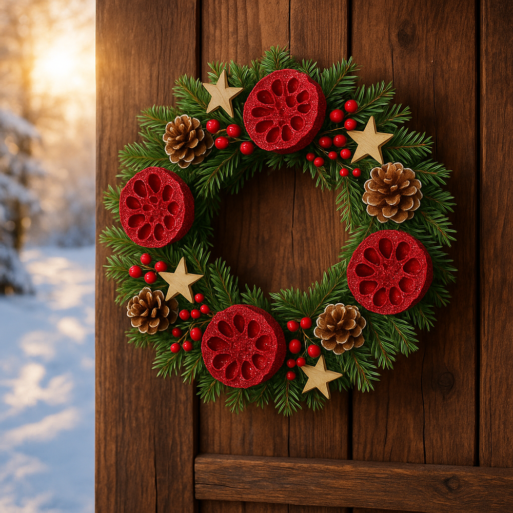 Lotos czerwony z lekkim brokatem, 6 sztuk w opakowaniu, średnica 6–8 cm. Naturalna dekoracja świąteczna do stroików, wieńców i zimowych aranżacji – elegancki, trwały i efektowny dodatek.