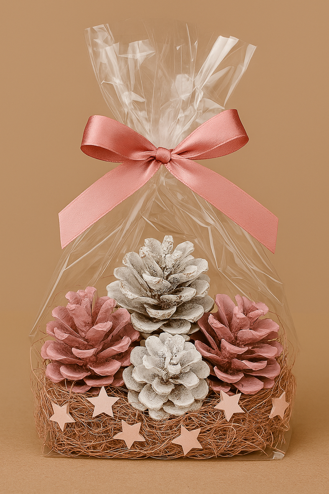 Szyszki ułożone są na różowych, naturalnych korzonkach, które tworzą efektowną, organiczną bazę dekoracyjną. Dodatkowe akcenty w postaci drewnianych gwiazdek w różu i bieli podkreślają świąteczny klimat.