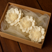 Dekoracja w pudełku prezentowym – kwiaty pięknie prezentują się na tiulu lub mechach suszonych; idealny, gotowy prezent handmade.